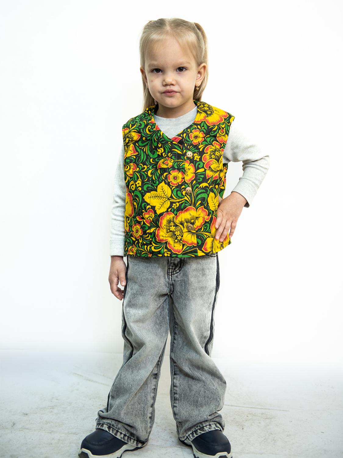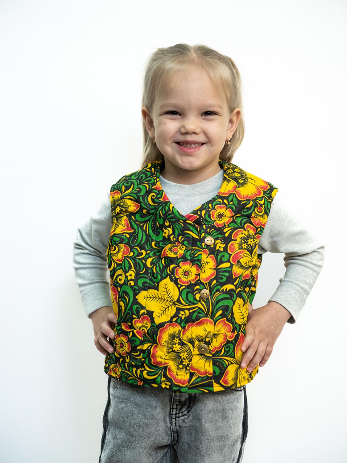 Жилет душегрейка от бренда Сокол – идеальный выбор для малышей в холодное время года. Этот утепленный жилет сделан из комфортного и теплого материала, который сочетает в себе бязь, полушерсть и натуральный ватин, обеспечивая идеальную теплоизоляцию и уют. Жилет украшен элегантной хохломой, которая добавляет ему особый шарм и выделяется на фоне других детских вещей.